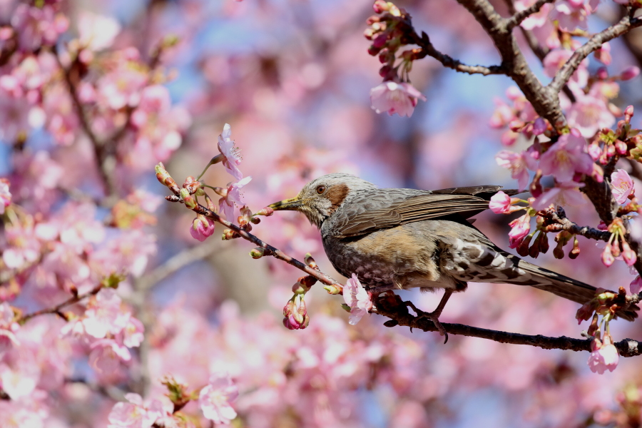 動植物園の駐車場に河津桜が植えてあります。その桜が見頃を迎えています。蜜を求めてメジロやヒヨドリが飛び交っています。いつもの春の情景です。春ですね!